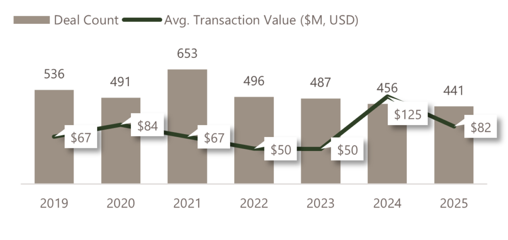 This sentiment was reflected in the quarterly pattern of M&A activity observed in 2025. Total reported deal count declined to 441 transactions, with average disclosed transaction value decreasing to approximately $82 million for the year. Activity was relatively stable in the first half—Q1 and Q2 recorded 115 and 121 transactions, respectively, at average values of $84 million and $79 million—before a pronounced slowdown in the third quarter.