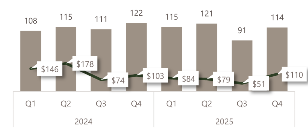 Q3 2025 saw deal volume fall to 91 transactions and average transaction value decline to $51 million, driven by heightened tariff and trade uncertainty that delayed buyer decisions and extended diligence timelines. As market conditions stabilized, activity rebounded in Q4, with 114 transactions and a recovery in average transaction value to approximately $110 million, signaling renewed buyer engagement toward year-end.