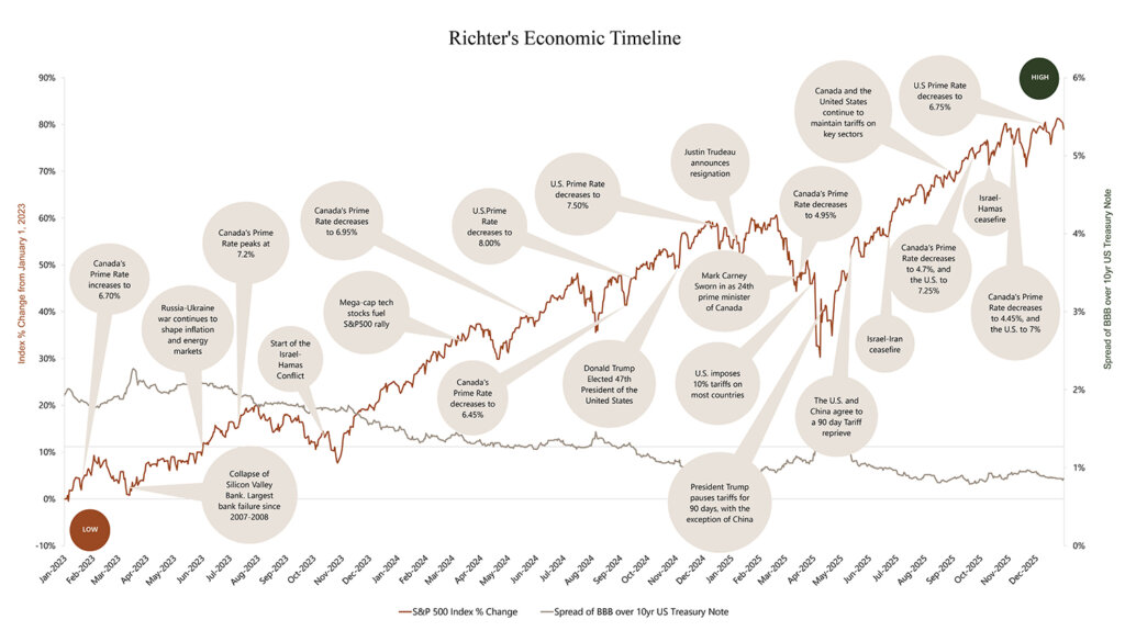 Richter’s economic timeline plots local and world events together with a depiction of the volatility of the stock market (S&P 500) and credit markets (the spread of publicly traded BBB corporate bonds over U.S. treasury notes).